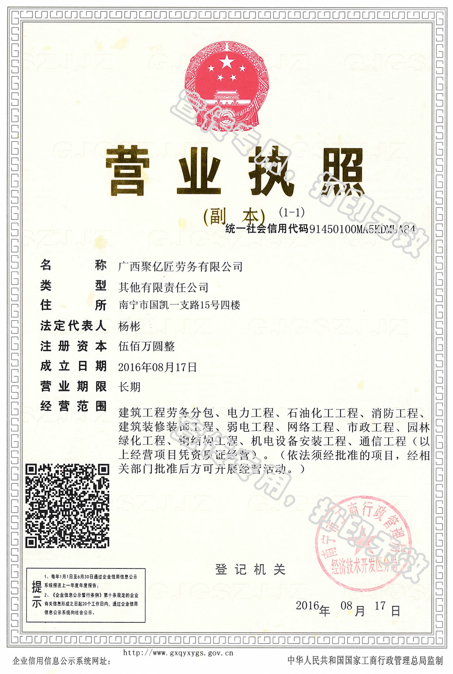 2017年5月15日,通過公司領(lǐng)導(dǎo)和同仁的努力,華輝集團旗下廣西聚億匠勞務(wù)公司成功通過申報建筑業(yè)企業(yè)資質(zhì)證書的行政許可審查,取得該項資質(zhì)。