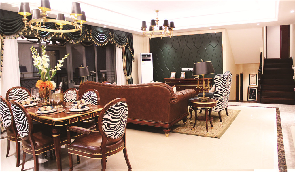 客廳:玄關(guān)地面采用水刀石材拼花,呈現(xiàn)推門而至的雍容氣度。墨綠造型硬包背景墻,搭配同色調(diào)窗簾,再來一抹淺綠碎花地毯,打造奢闊會客天地的同時(shí),也增添了清新舒適味道。