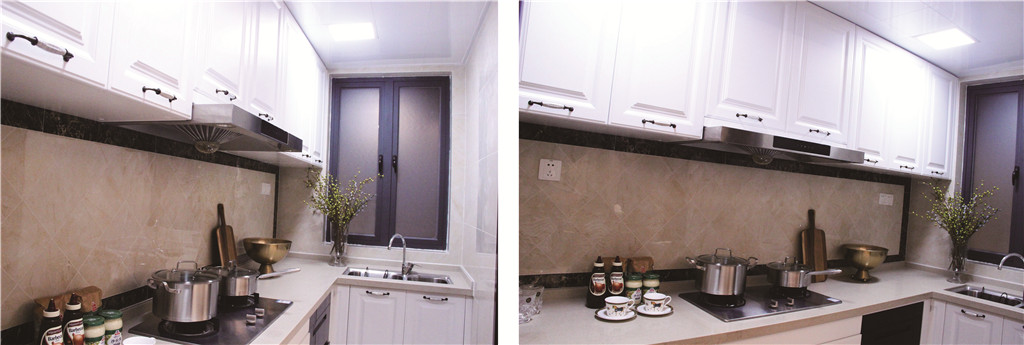 廚房:簡約的白色櫥柜,與黑色瓷磚相呼應(yīng),鑄造了熠熠生輝的夢想廚房。每一天裊裊升起的氤氳熱氣,就是為家人準(zhǔn)備美食的溫馨時(shí)刻。