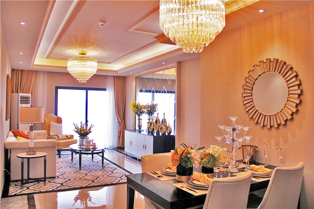 客廳、餐廳:華麗吊燈營造大氣且充滿溫馨感的居家氛圍。地面以簡約的走線風(fēng)格,規(guī)整且自然,電視背景墻的石材邊框,讓空間更寬闊,承載全家人的幸福生活。