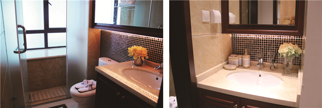 衛(wèi)生間: 防滑處理的淋浴間大理石與整體的仿古瓷磚渾然一體,穿插的馬賽克瓷磚,讓人眼前一亮,奢華藝術(shù)已然融進(jìn)空間的每一個(gè)角落。