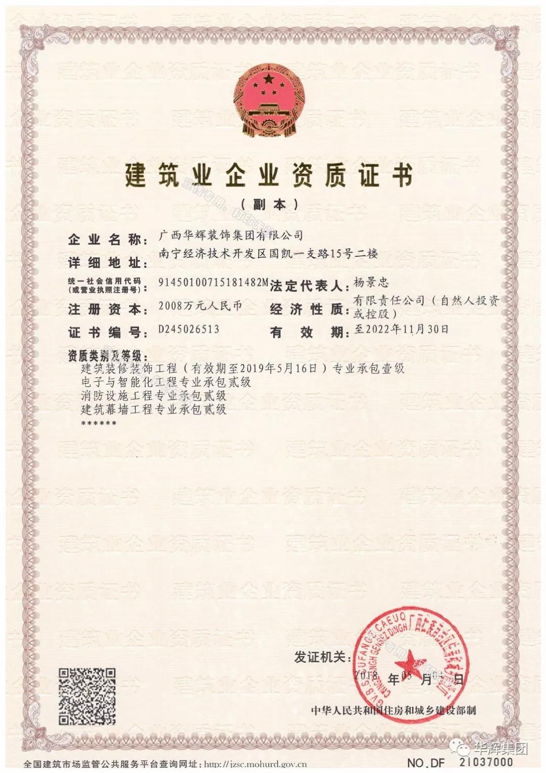▲華輝裝飾集團(tuán)喜獲電子與智能化工程專業(yè)承包貳級資質(zhì)、建筑工程施工總承包叁級資質(zhì)、機(jī)電工程施工總承包叁級資質(zhì)!
