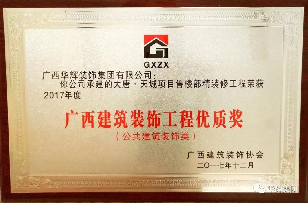 ▲3月29日,廣西建筑裝飾協(xié)會第六次會員代表大會暨表彰大會上,華輝裝飾集團(tuán)喜獲多個獎項:“2017年度廣西建筑裝飾工程優(yōu)質(zhì)獎(公共建筑裝飾類)”,“2016年度廣西建筑裝飾行業(yè)先進(jìn)企業(yè)”,“2016年度廣西建筑裝飾行業(yè)優(yōu)秀企業(yè)經(jīng)理”及“2016年度廣西建筑裝飾行業(yè)優(yōu)秀建筑裝飾設(shè)計師”