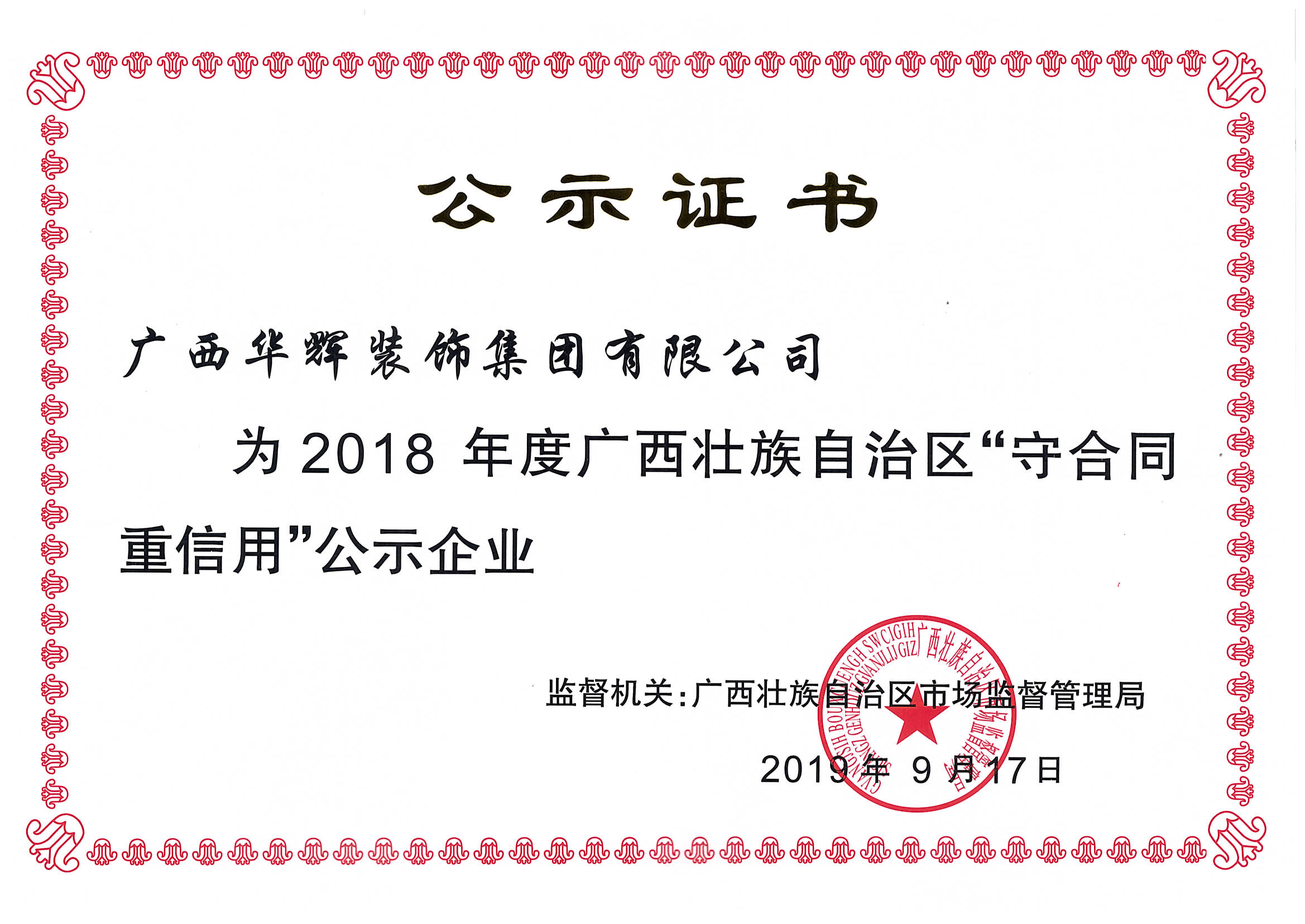 近日,在廣西壯族自治區(qū)市場(chǎng)監(jiān)督管理局開展的“守合同重信用”企業(yè)評(píng)選活動(dòng)中,華輝憑借自身良好的信用體系建設(shè)、誠(chéng)信守約形象,榮獲2018年度廣西壯族自治區(qū)“守合同重信用”企業(yè)。