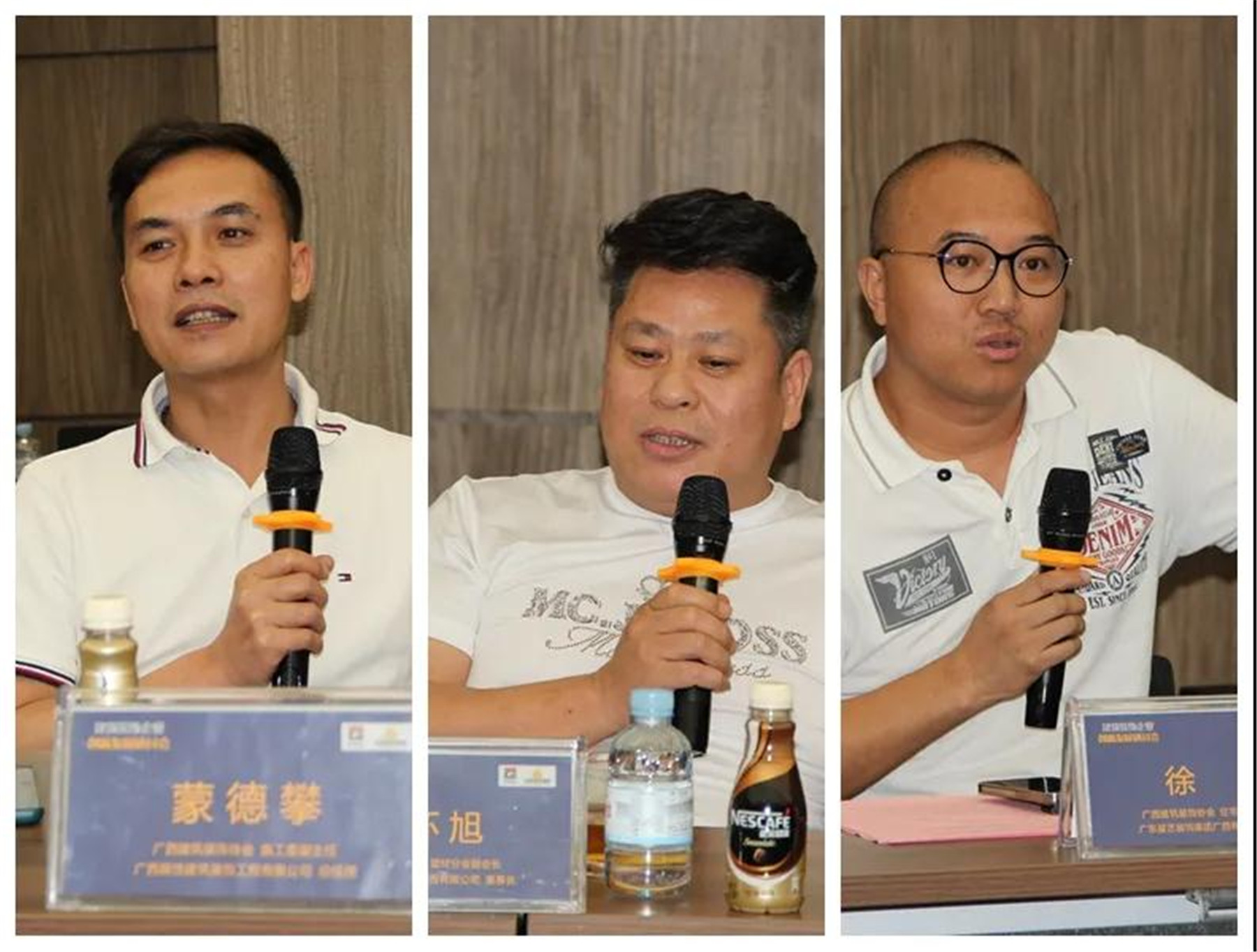 ▲(左)住宅裝修分會(huì)副會(huì)長(zhǎng)、廣西中庭裝飾工程集團(tuán)有限公司董事長(zhǎng) 丁胡,(中)廣西渱鈺川裝飾工程有限公司總經(jīng)理 李靈,(右)廣西建科院建筑裝飾工程有限公司總經(jīng)理 鄒詩(shī)毅