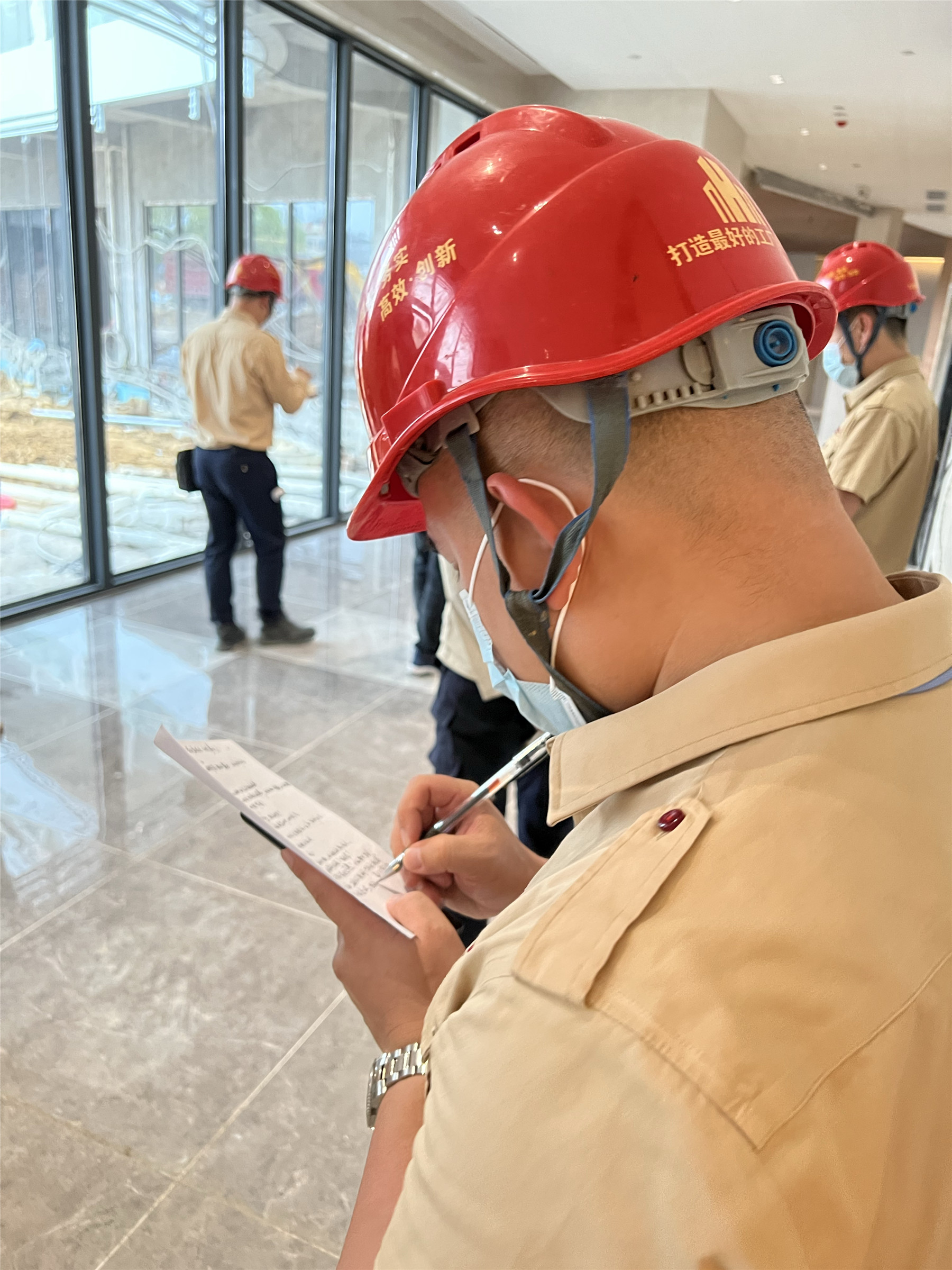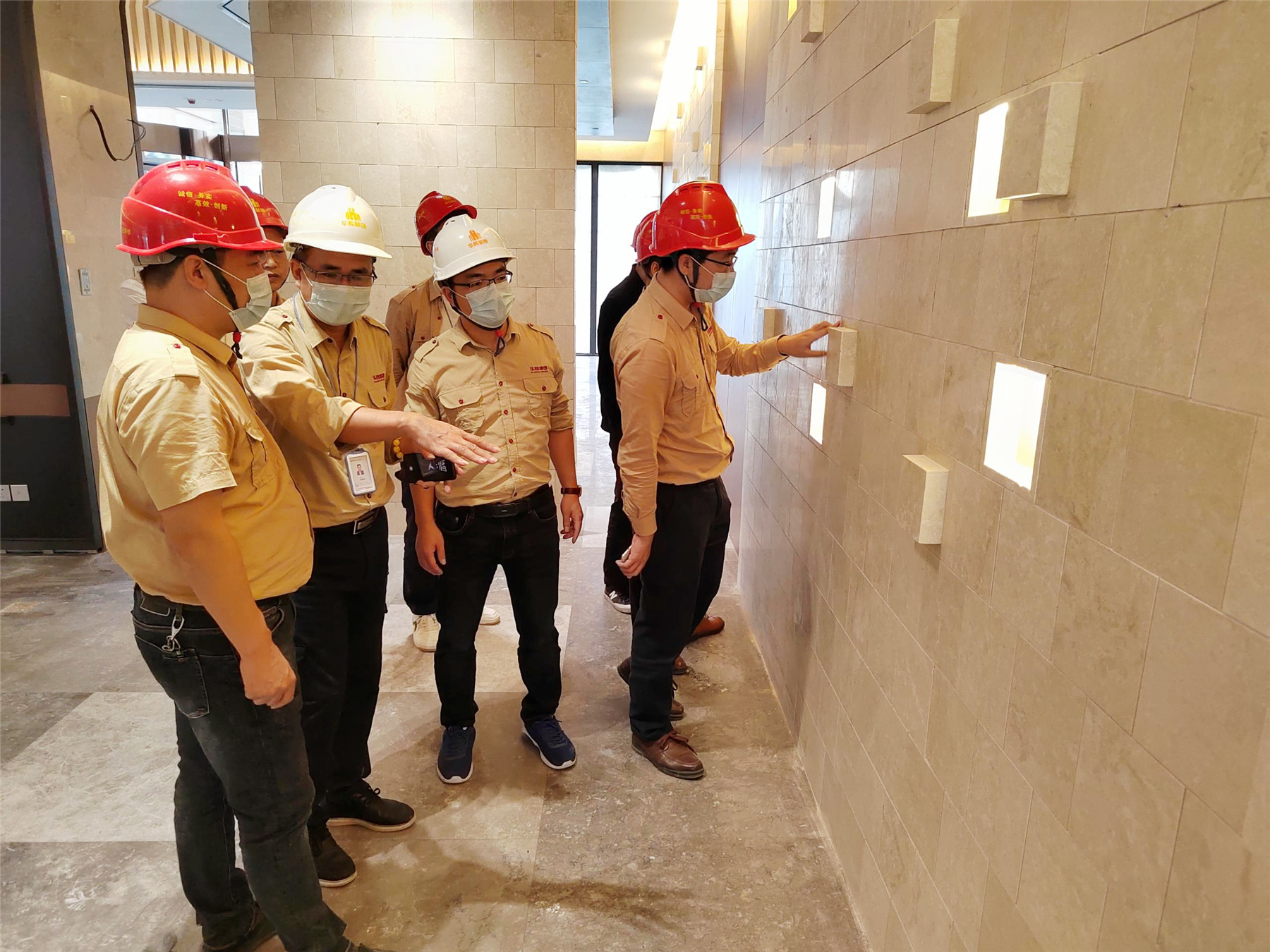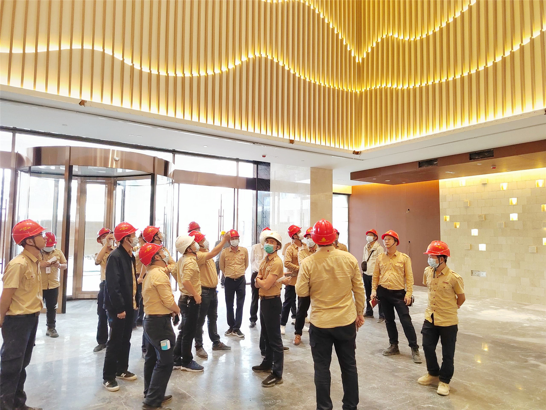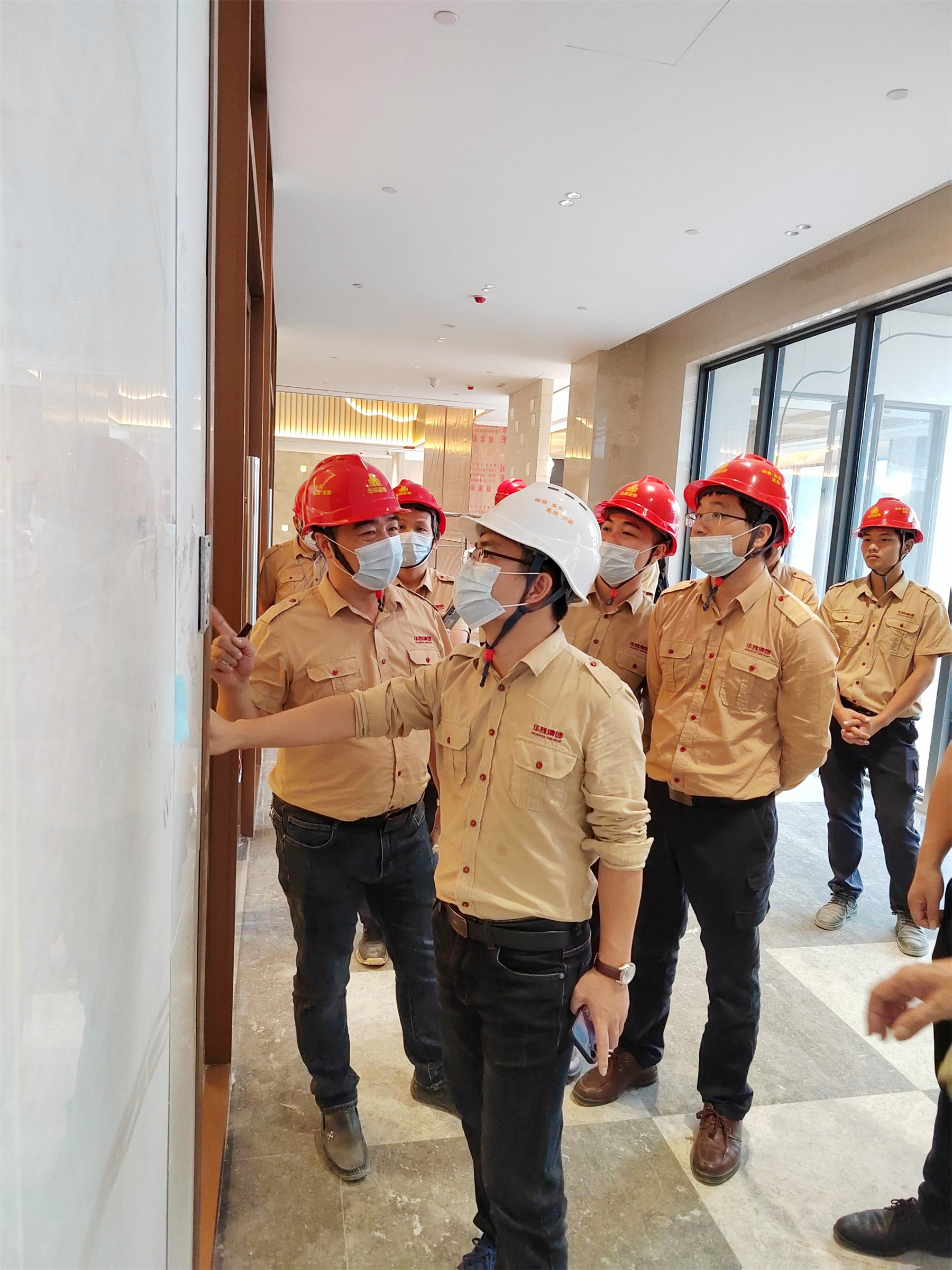全體與會人員實地觀摩陸川·溫泉九龍山莊裝修工程,項目部相關(guān)人員詳細(xì)介紹了施工過程中的重點、難點。本次的觀摩會,聚焦項目管理以及施工工藝工法。本項目從前期項目策劃、材料的層層把控到施工細(xì)節(jié)的營造,無不體現(xiàn)華輝人對精工品質(zhì)的追求。
