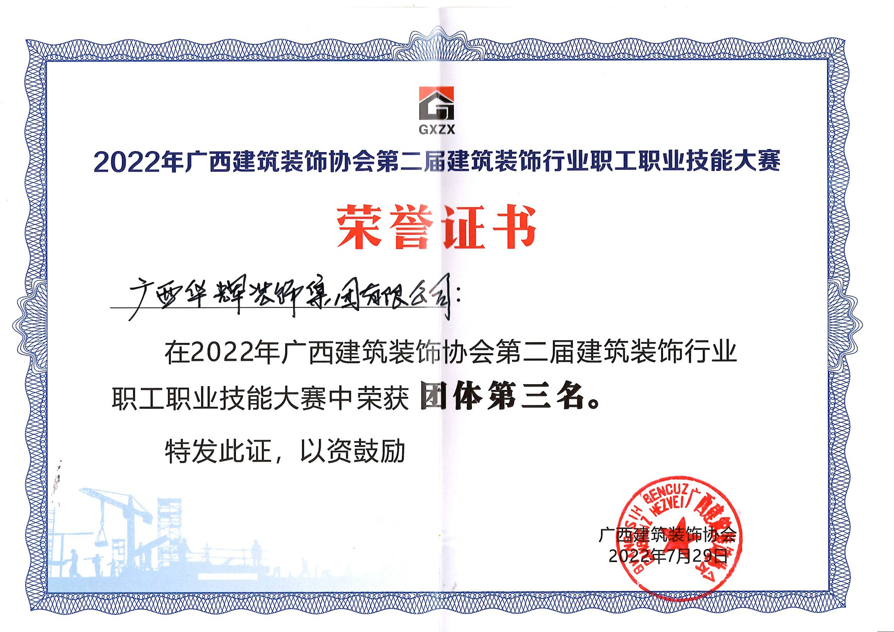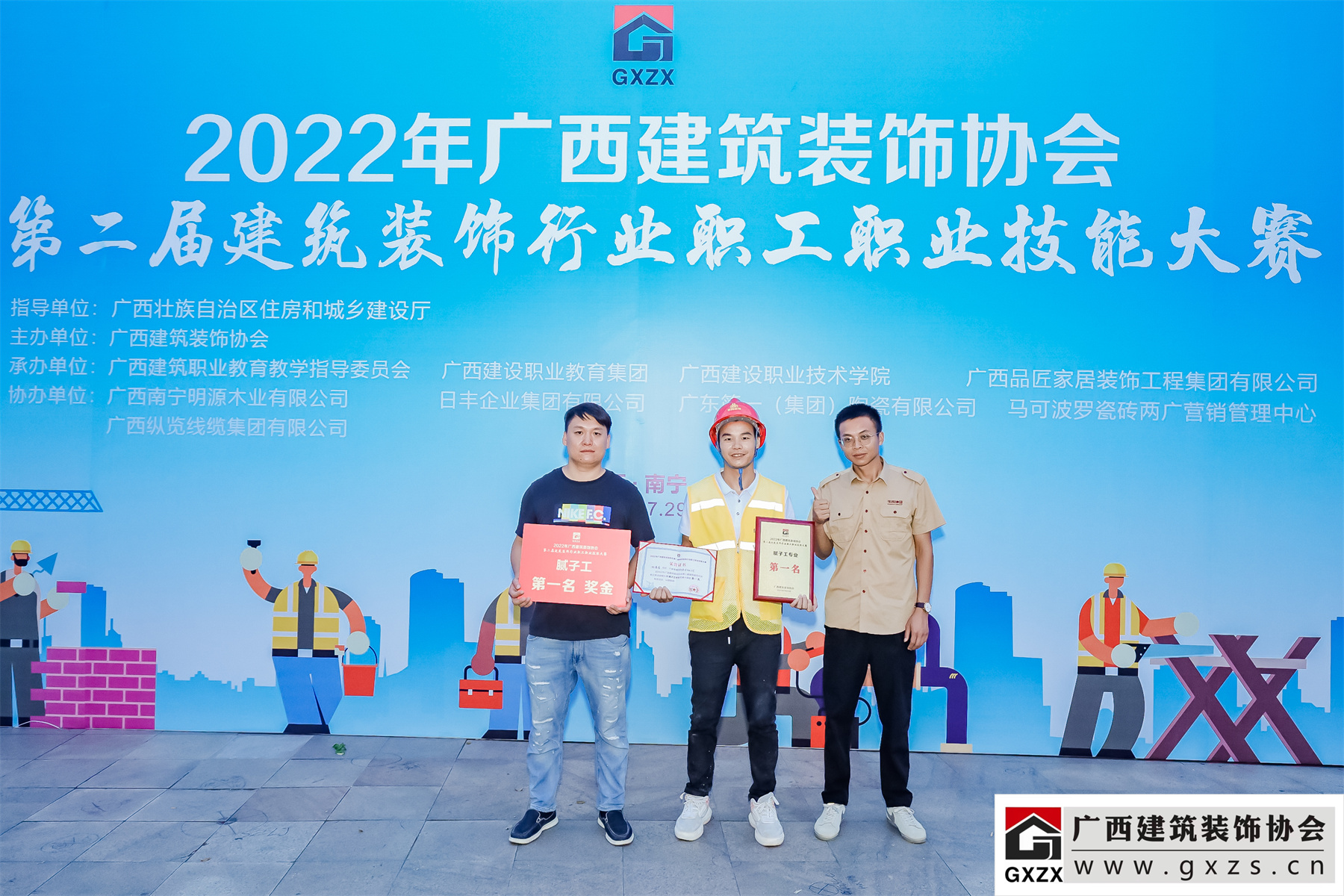 2022年7月29日,2022年廣西建筑裝飾協(xié)會“第二屆建筑裝飾行業(yè)職工職業(yè)技能大賽”,在廣西建設職業(yè)技術學院落下帷幕,華輝集團榮獲膩子工第一名、團隊第三名、精細木工第三名、管道工和瓷磚貼面第五名的好成績。