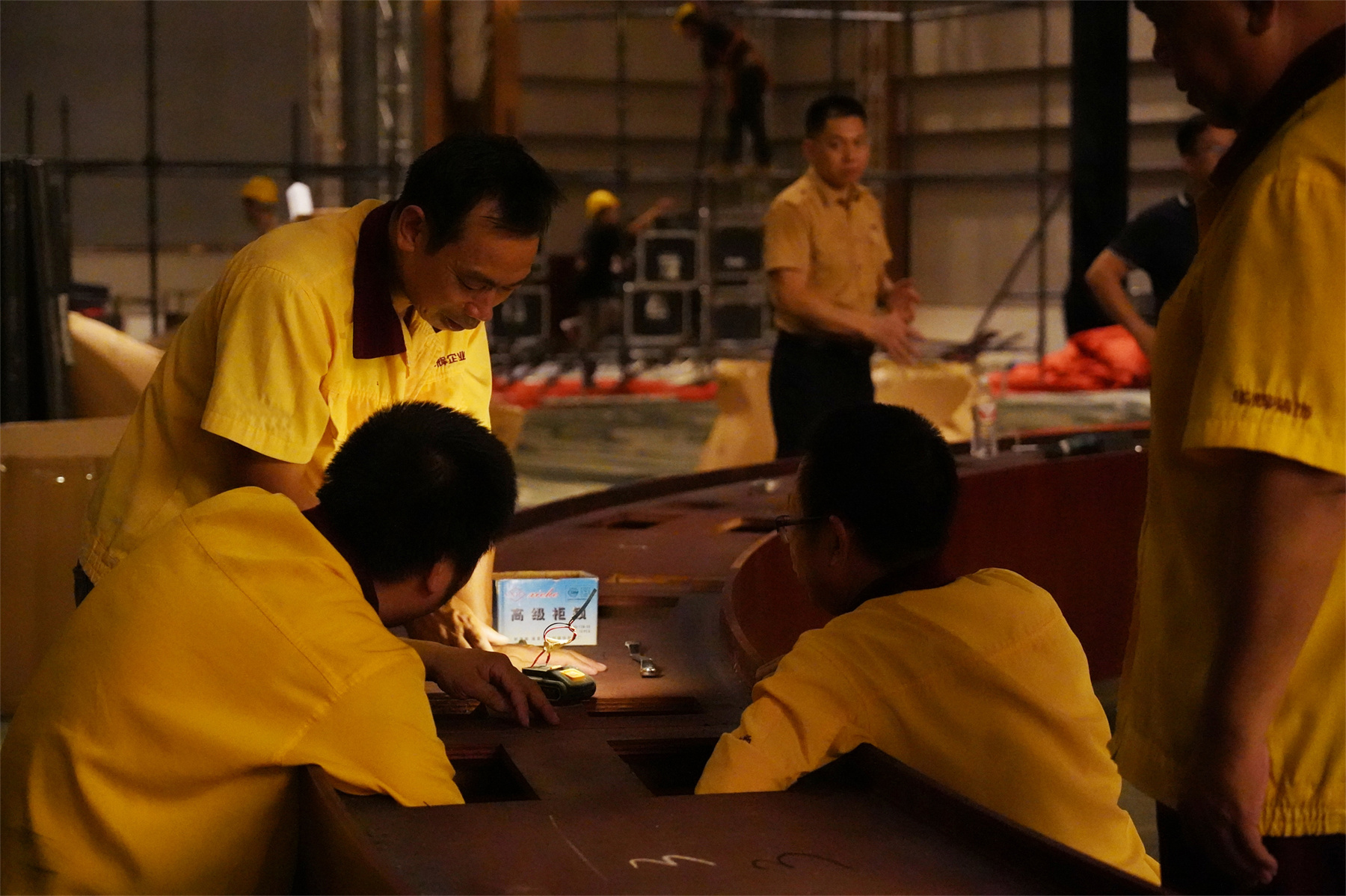 接到任務(wù)后,華輝深感使命光榮、責(zé)任重大。大圓桌直徑12米,周長(zhǎng)37.69米,超大型的弧形結(jié)構(gòu)增加了生產(chǎn)難度,且工期非常緊張。為有效縮短工期,華輝采用工廠工業(yè)化部品部件,將超大型的弧形結(jié)構(gòu)逐一分解,拆分工藝、結(jié)構(gòu)和形體。