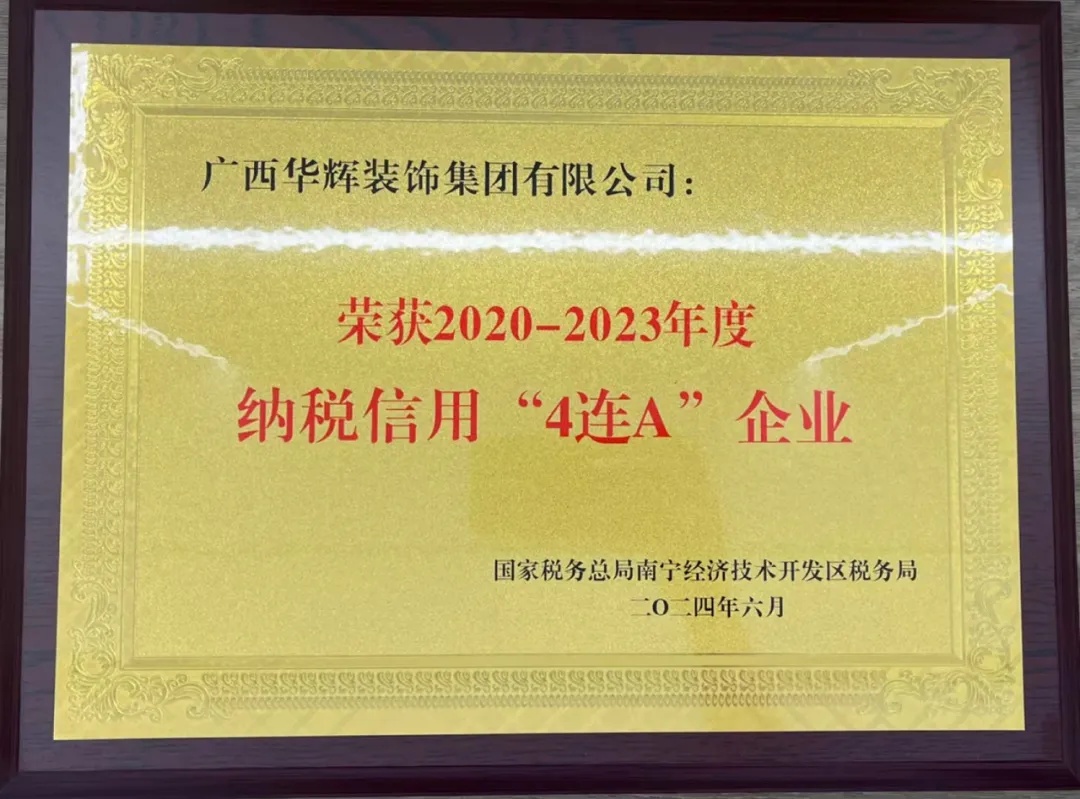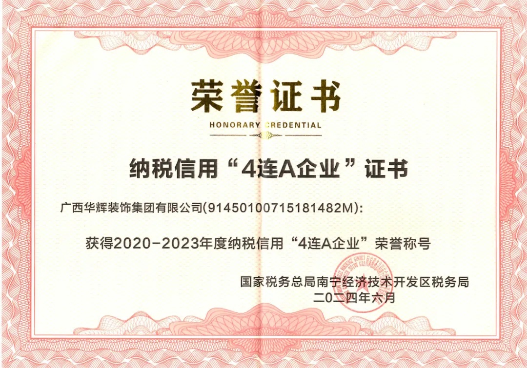 近日,廣西華輝裝飾集團憑借良好的納稅信譽,獲得國家稅務總局南寧經(jīng)濟技術(shù)開發(fā)區(qū)稅務局2020-2023年度納稅信用“4連A企業(yè)”榮譽稱號。