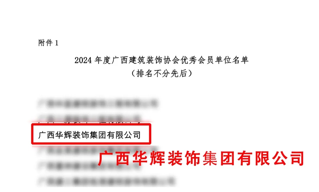 廣西華輝裝飾集團自加入廣西建筑裝飾協(xié)會以來,在協(xié)會的指導(dǎo)幫助下,深耕裝飾領(lǐng)域,實力持續(xù)攀升,目前是廣西建筑裝飾協(xié)會的常務(wù)副會長單位。未來,華輝將在主管部門及協(xié)會的領(lǐng)導(dǎo)下,與各界同仁一起,共同為推動廣西建筑裝飾行業(yè)健康發(fā)展添磚加瓦!